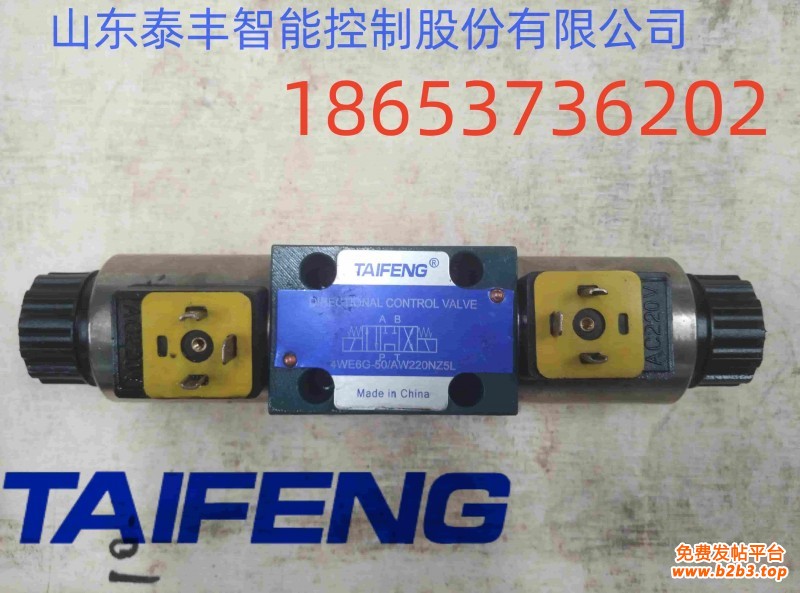 山东泰丰智能控制股份有限公司(原山东泰丰液压股份有限公司)生产的4we6型电磁换向阀是用电磁铁直接推动阀芯移位工作的小型方向控制阀,主要用于控制液体的通断和流动方向,也可以作为先导控制阀,以控制各种大通径的液压阀(电液换向阀或二通插装阀),实现对大功率液压阀的先导控制。其特点是:1.以直动式电磁铁操作方向滑阀作为标准类型;2.安装面符合DIN24340A型ISO4401和CETOP-RP121H;3.带可拆卸线圈的湿式直流获交流电磁铁;4.电磁铁可旋转90度;5.可以迅速而方便的更换电磁铁线圈而不引起液压系统漏油;6.可选的手动应急操作