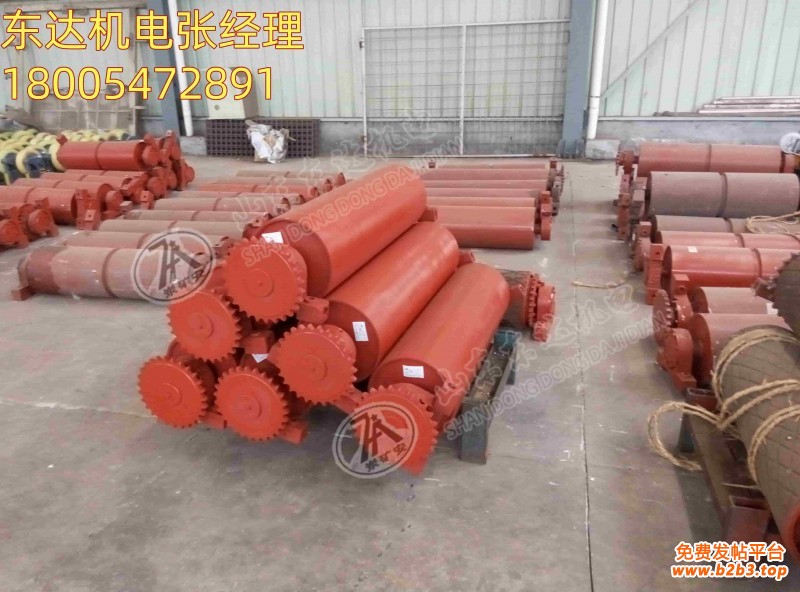 驱动滚筒是传递动力的主要部件。为了传递需要的牵引力,输送带与滚筒间要具有足够的摩擦力。根据摩擦传动的理论,在设计或选择驱动装置时,可采用增加输送带与驱动滚筒间的摩擦和围包角的方法来保证获取需要的牵引力。采用单滚筒驱动时,围包角可达180°-240°;当采用双滚筒驱动时,围包角为360°-480°左右。用双滚筒传动能大大提高输送机的牵引力,所以常常被采用,尤其当运输长度比较长时,一般采用双滚筒驱动。驱动滚筒外表面一般是尼龙材料做的胶面,并有人字形或X的沟槽以增加滚筒的摩擦力。