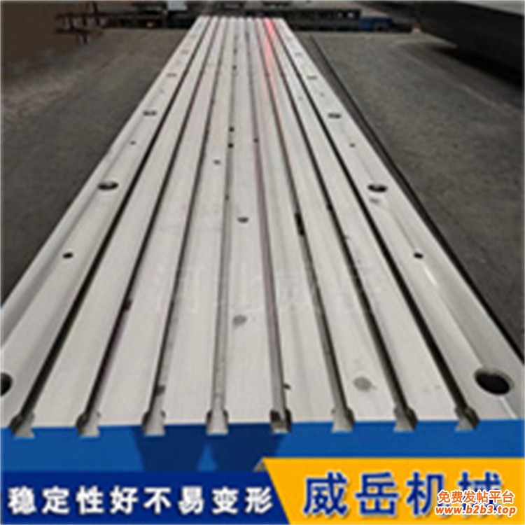 T型槽平台强度铸铁HT200-300工作面硬度为HB170-240,经过两次人工处理(人工退火600度-700度和自然时效2-3年)使用该产品 的精度稳定,耐磨性能好。T型槽平台在机械工厂往往作为平面基准,被修T型槽平台与基准平板进行拖研铲刮,T型槽平台平面度的好坏直接影响产品质量检测的可靠程度。且规格需要大于被修T型槽平台,工厂对检验平板的要求。T型槽平台的铸铁质量和热处理质量对平台使用性能产生较大影响:或因残存较大内应力使工作面变形;或因不耐磨损使精度不能保持;或因刮削困难得不到数值小的粗糙度。因此生产铸铁T型槽平台须注意铸铁材料的选择,采用时效处理等方法除铸铁T型槽平台的残余应力。所以要用正确的保护措施来延长铸铁T型槽平台的使用寿命,使投入与产出比达到一个很好的平衡。