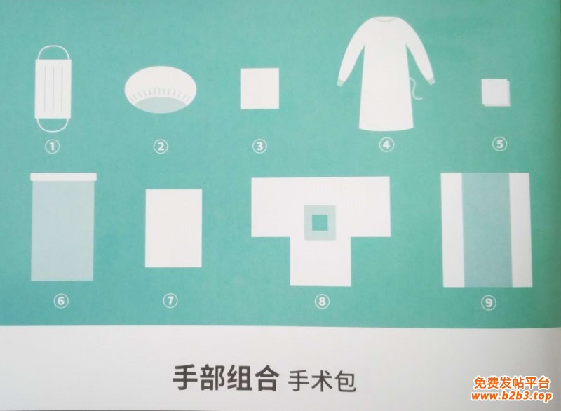 手术包配置:一次性使用医用口罩1个、一次性使用帽1个、器械盘套1条、擦手巾(40*40cm)4块、一次性使用手术衣2件、纱布块10片、一次性使用医用垫单(臀底单)1条、一次性使用手术洞巾(手部单)1条、一次性使用包布1条。