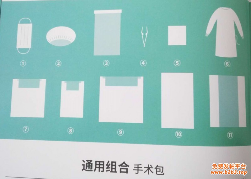 手术包配置:一次性使用医用口罩1个、一次性使用帽1个、器械盘套1条、镊子1把、擦手巾(40*40cm)4块、一次性使用手术衣2件、脚单(加强型)1条、边单(加强型)2条、头单(加强型)1条、一次性使用医用垫单1条、一次性使用包布1条。
