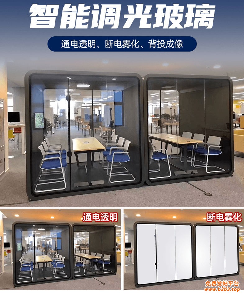 ★隐私保护(调光玻璃可以根据需要在不透明和透明之间切换,提供隐私保护。这对于办公室分隔、卫生间、会议室等场所非常有用)