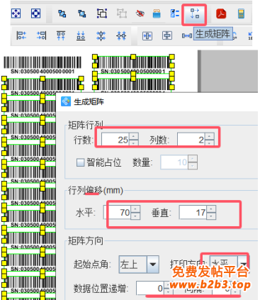 这样做出来的条形码扫描出来的内容就是:0305004005000001不带SN:。选中这个条形码,点击“生成矩阵”图标,弹出的窗口中,设置25行2列,调整要阵列的每个条形码的偏移距离(或者是间隔),阵列方向,然后点确定,阵列出来剩余的49个条形码。