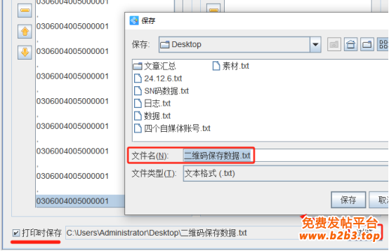 3. 二维码数据源中数据添加完成之后,将下面的“打印时保存”勾选上,点击后面的“浏览”按钮,设置打印时保存数据的文件保存位置和文件名称。