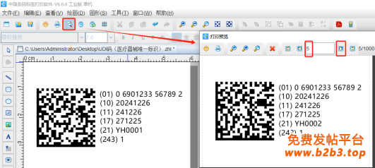 3. 设置完成之后,点击软件顶部工具栏中的“打印预览”按钮,翻页查看批量生成的二维码标签,预览无误就可以直接连接打印机打印出来或者批量输出PDF文档、图片、TIF文档等。
