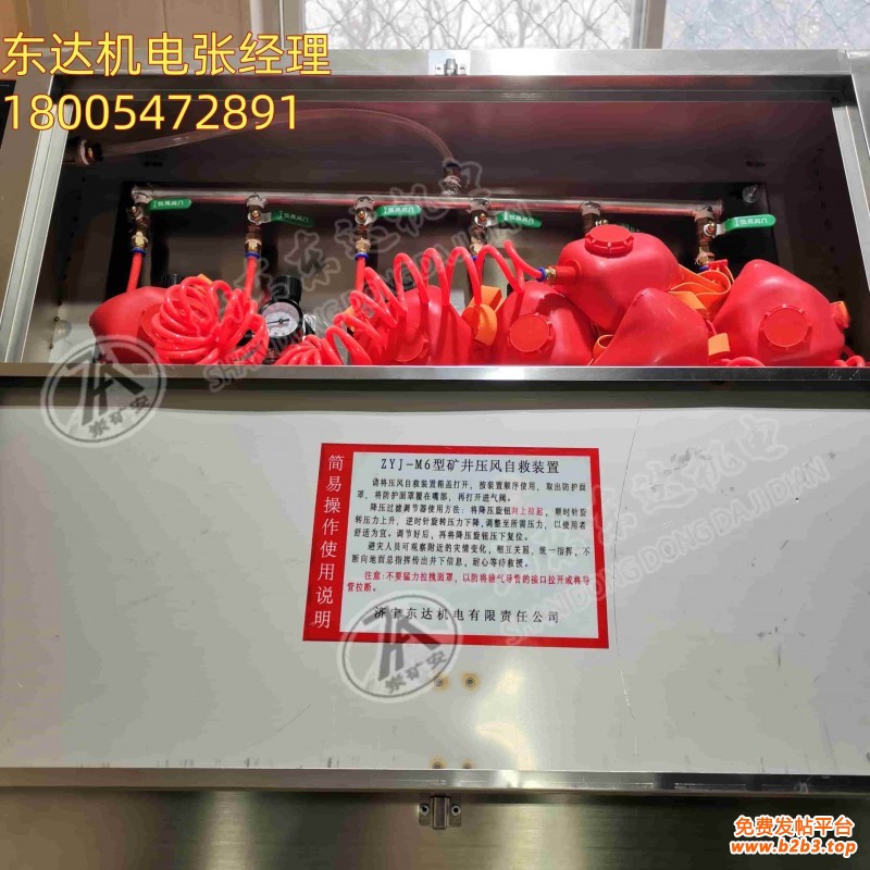 主要ZYJ-M型矿井压风自救装置是一种新型的隔绝式气体呼吸防护装置,本装置一箱六组(可根据要求设计组别),能同时提供六人使用,达到互相照顾的效果。