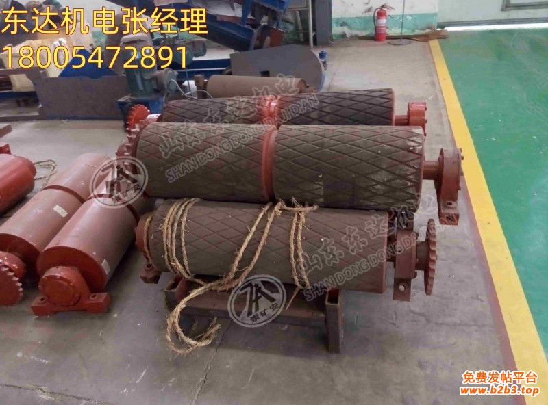 驱动滚筒是传递动力的主要部件。为了传递需要的牵引力,输送带与滚筒间要具有足够的摩擦力。根据摩擦传动的理论,在设计或选择驱动装置时,可采用增加输送带与驱动滚筒间的摩擦和围包角的方法来保证获取需要的牵引力。采用单滚筒驱动时,围包角可达180°-240°;当采用双滚筒驱动时,围包角为360°-480°左右。用双滚筒传动能大大提高输送机的牵引力,所以常常被采用,尤其当运输长度比较长时,一般采用双滚筒驱动。驱动滚筒外表面一般是尼龙材料做的胶面,并有人字形或X的沟槽以增加滚筒的摩擦力。