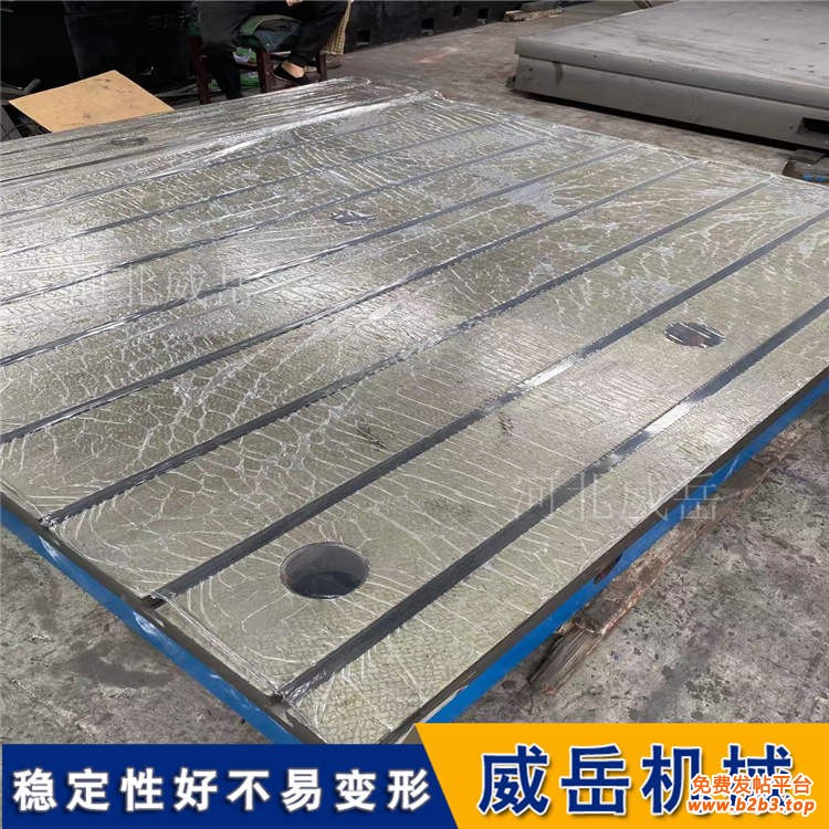 十二、正确使用:铸铁平台在调试完成后即可使用,室温控制在20±5℃使,在台面上检测工件要轻放轻挪,不要集中使用一个区域,尽量均匀使用整个铸铁平台大型铸铁平台用于零件划线研磨加工,安装设备等。铸铁平板是检验机械零件平面、平行度、直线度等形位公差的测量基准,也可用于一般零件及精零件的划线,铆焊研磨工艺加工及测量等,还可用于机床机械检验测量基准。工作面上开孔和T型槽,孔主要用来清理铆焊时的一些铁渣和焊接废弃物,T型槽主要是用来固定工件。用于机械发动机的动力试验,调试设备。具有较好的平面稳定性和韧性。表面带有T型槽。主要用来固定工件。是钳工工人用来调试设备,装配平台,维修设备的基础工作面。