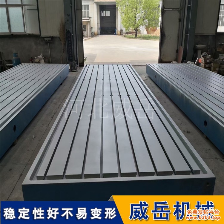 对于高品质T型槽平台而言,选材首先要满足高强度要求。若选用强度不足的普通铸铁或钢材,在承载较重工件或承受瞬时冲击力时,平台表面易出现凹陷、裂纹甚至整体变形,不仅无法保证工件的安装精度,还可能因结构失效引发安全事故。其次,良好的韧性同样关键。机械加工过程中难免出现轻微的振动或冲击,韧性不足的材料易出现脆性断裂,而好的材料能通过自身韧性吸收冲击能量,避免平台损坏。例如,常用的高强度灰铸铁HT250,其抗拉强度和抗弯强度远优于普通灰铸铁,能有效满足中大型工件的支撑需求;对于精度要求更高、载荷更大的场景,选用球墨铸铁QT450-10或合金铸铁,可进一步提升平台的综合力学性能。http://www.chinaweiyue.com/